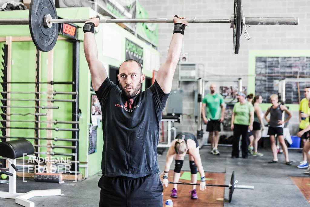 35 pound Dumbbell thruster, 8 reps